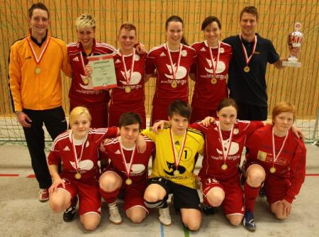 Die 19. Hallenlandesmeisterschaft der Frauen, die in einem sehr fairen Rahmen verlief, hatte am Sonntagnachmittag (06.02.) in der Jahnsporthalle Arnstadt mit dem SC 03 Weimar einen verdienten Sieger. Die Schützlinge von Trainer Thomas Müller, derzeit in der Verbandliga Vierter, gewannen dabei das Endspiel gegen den Regionalligavertreter 1. FFV Erfurt mit 2:0. "Weimar zeigte sich taktisch hervorragend eingestellt, dominierte das Finale und gewann völlig berechtigt", meinte auch Gudrun Gania, Mitglied des Frauen - und Mädchenausschusses im TFV und Turnierleiterin der fünfstündigen Veranstaltung. Die Tore erzielten Manja Seeger und Christina Malisius. Dabei war der SC 03 weiteren Treffern nahe.