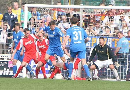 Der ZFC nahm jetzt erst recht den Kampf an und erspielte sich folglich weitere Großchancen. Nach einer Oswald-Ecke verfehlte F.Müller mit seinem Kopfball nur knapp das CZ-Tor (31.) und K.Oswald setzte einen seiner vielen Freistöße ebenfalls nur wenig übers Tor (33.). Durch Schröter kamen die Jenenser nach einem sehenswerten Spielzug mit gutem Doppelpass, an dem Hähnge beteiligt war, sogar zum 3:0. Schröter hatte mit sehr gekonntem Heber, einer Superaktion, nach erneutem Abpraller ins ZFC-Tor getroffen (34.). Dies stachelte die Hausherren wiederum an. Konnte Keeper Nulle nach einem Oswald-Versuch nur mit der Faust zur Ecke lenken, war er dann gegen den anschließenden Bocek-Kopfball aus Nahdistanz machtlos (37.). Die Hoffnung auf einen Foulelfmeter, an der Strafraumgrenze durch Peters verursacht(39.), erfüllte sich nicht und K.Oswald schoss den gegebenen Freistoß nur um Zentimeter über die Querlatte. Er hatte damit wohl auch wieder das Gästeteam geweckt, denn O.Dix musste darauf einen Amirante-Flachschuss halten und sie setzten weitere gefährliche Vorstöße, meist über die rechte Außenbahn, an. In einer zweiten Angriffswelle kam eine weite Flanke von der linken Seite. Bei dieser griff O.Dix daneben und durch diesen Torwartfehler verhalf er Amirante zum Torerfolg (44.). Vor dem Pausenpfiff hatte der FC CZ Jena, der sich teilweise wirklich wie ein Absteiger der 3.Liga präsentierte, so den 3-Tore-Abstand mit der großen Hilfe des ZFC wiederhergestellt. Viele der Zuschauer hofften trotz dieses Halbzeitresultats, aber auch wegen der relativ guten Spieleinstellung des ZFC, auf Besserung.
