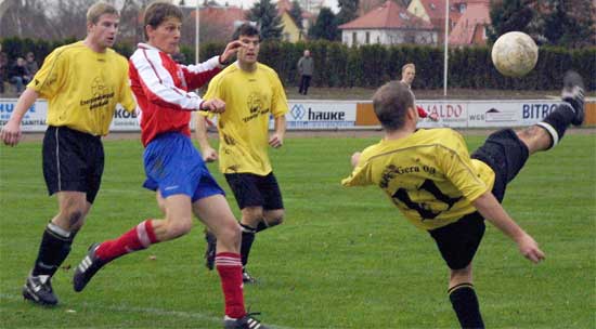 Diesen Versuch von Marc Janke überstehen die Sömmerdaer um Marco Wendelin schadlos, acht andere aber nicht. SÖMMERDA. Natürlich waren die mit vielen bundes-, regional- und oberligaerfahrenen Akteuren bestückten Ostthüringer vom Anpfiff weg das dominierende Team, doch da sich die FSV-Elf nicht versteckte und einige Male gefährlich vor dem Gästetor auftauchte, gab es mehmals Beifall von den bezüglich der Bedeutung dieses Spiels wieder mäßig besetzten Rängen des Kurt-Neubert-Sportparks (130 Zuschauer). Vor allem Stefan Kohlmann, der den gelb-gesperrten Kapitän Dominik Hoffmann vertrat, hatte eine starke 1. Halbzeit mit zwei gefährlichen Schüssen aufs Tor. Den ersten wehrte Raphael Baumann in der 3. Minute mit den Fingerspitzen zur Ecke (die es nicht gab!), der zweite landete genau in den Armen des FC-03-Schlussmanns, da Andre Tews den Sömmerdaer noch entscheidend stören konnte (35.). Beim Freistoß von Thomas Nowacki (9.) und dem Versuch von Axel Nasse hatte Baumann wenig Mühe (23.). Die besseren Möglichkeiten besaß aber der Gast, der jedoch - nachdem anfängliche Abstimmungsprobleme im Aufbauspiel behoben wurden - sträflich damit umging. So scheiterten Marc Janke (19.) und Marco Weißhaupt (41.) an FSV-Torwart Maik Städtler, zielten Andy Raab (14.), Enrico Neubert (27.) und Rock-Simplice Embingou (34.) jeweils aus aussichtsreichen Positionen daneben oder drüber. Dagegen kläglich vergeben wurden die klarsten Chancen der ersten 45 Minuten. So schob Janke den Ball nach einer Raab-Flanke vollkommen frei stehend aus fünf Metern über den Kasten (29.) und bekam Embingou nach einem Solo durch den FSV-Strafraum den Ball nicht an Städtler vorbei (42.).