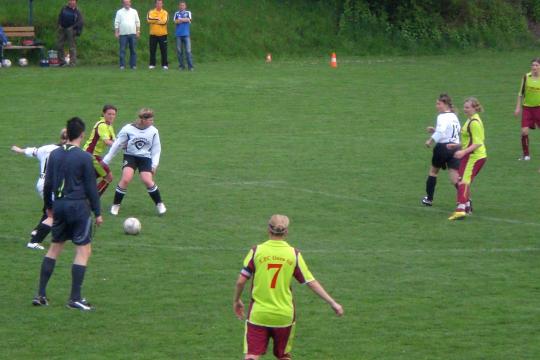 Unter Dauerdruck von der ersten Minute an stehen die Süd-Frauen. Ziel war es, eine ordentliche Partie abzuliefern und mit erhobenen Hauptes den Platz zu verlassen. Bereits in der 8.Spielminute war es dann soweit. Der große Favorit geht mit 1-0 durch Trepschinski nach einen Eckball in Führung, wobei die Torschützin am langen Pfosten allein stand. In der Folgezeit können sich die Süd-Frauen ein wenig befreien und nehmen am Spiel teil. Doch dann ist alles anders - in der 22.Minute schickt der nicht immer überzeugende Schiedsrichter Ronny Köhler Sarah-Maria Steppe nach Tätlichkeit vom Feld. Im Mittelfeld wird Sarah von Melanie Piatkowski gefoult, diese dann noch im Liegen nachtritt. In diesem Augenblick tritt Sarah ebenfalls nach. Doch der Schiedsrichter stellt nur Sarah vom Platz. Selbst nach dem Spiel hat Gästetrainerin Klepsch gesagt, entweder beide verwarnen, Gelb oder Rot - aber für BEIDE. In Unterzahl wird es jetzt natürlich doppelt schwer, zumal das Team in Rückstand liegt. Bis kurz vor der Halbzeit kann das 0-1 durch eine kämpferische Mannschaftsleistung gehalten werden. In mehreren Situationen ist Stephanie Großer im Süd-Tor nicht zu überwinden, wobei die Gäste bei 2 Pfostenschüssen auch Pech haben oder sich selbst anschiessen bei Torschüssen. In der 44.Spielminute geht der Favorit 2-0 in Führung, ein Ballverlust in Vorwärtsbewegung bestraft Diana Raabe mit dem Tor. Doch die Frauen und Mädchen um Kapitän Timmig kämpfen weiter und geben nicht auf. Dies wird noch vor der Halbzeit mit dem Anschlusstreffer von Denise Werner belohnt. Einen Konter nimmt Denise auf und läuft durch das "FC 03"-Mittelfeld und zieht aus 22m ab und hämmert den Ball in Winkel.
