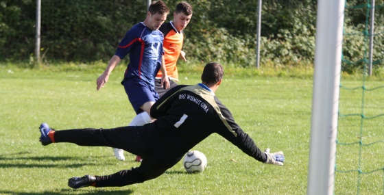 Wismut-Torwart Manuel Gutjahr lässt sich von Oliver Pohl von der SG Lusan/Liebschwitz nicht überwinden. Nur 14 Minuten halten sieben sieben Orange-Schwarze im Pokal durch. Danach bricht Referee Geidel die Partie ab. (Foto: Jens Lohse) |