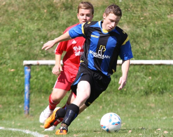 Ronneburgs Steve Senff (vorn) steuert im Triebes ein Tor zum 5:3-Erfolg im Pokal bei. (Foto: Jens Lohse)