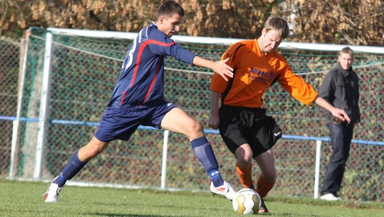 Gastgeber-Kicker Manuel Rittirsch (l.) versucht, sich im Zweikampf gegen den Daßlitzer Ronny Jäschke zu behaupten. (Foto: Jens Lohse)
