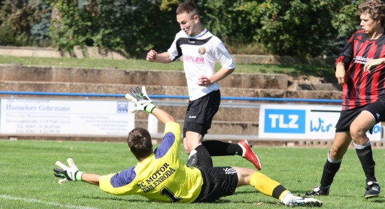 Nils Klopfer (Mitte) vergibt die große Chance zum zweiten Geraer Tor. Zunächst umspielt er Zeulenrodas Torwart Marcel Seiler, trifft dann aber nur den Innenpfosten. Dennoch behauptet sich der JFC im Landespokal mit 1:0. (Foto: Jens Lohse)