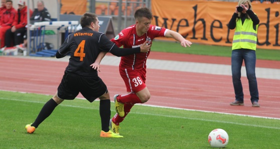 Erfurts Patrick Göbel (r.) will dem Geraer Phillip Roy auf der linken Außenbahn enteilen. Am Ende zeichnet der Rot-Weiß-Kicker in einem spannenden Pokalkampf im Stadion der Freundschaft für den 2:1-Siegtreffer des Drittligisten verantwortlich. (Foto: Thomas Schwarz)